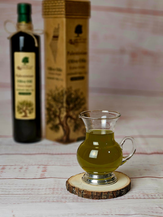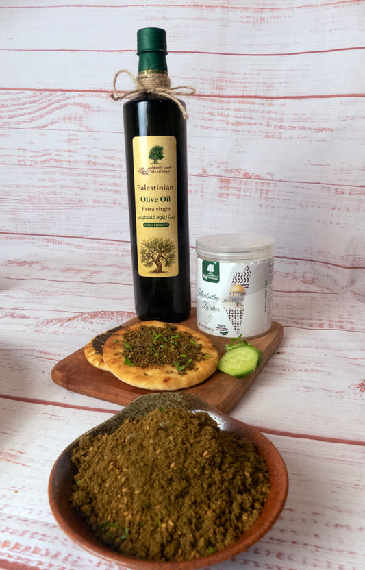 Our extra virgin olive oil comes from small, family-owned farms in a town called Kharbatha, located in Ramallah in the West Bank. The Palestinian olive oil season starts in mid-October and lasts until late December. Produced from rain-fed, hand-picked olives, the oil is extracted using a natural cold extraction process that preserves all the benefits of this wonderful fruit. This extra virgin oil connects you with farmers whose ancestors have tended their olive trees by hand for countless generations. Palestinian olive oil is known for its strong, distinctive aromatic scent and rich flavor. Extra virgin olive oil, in particular, has a peppery taste and slight bitterness (a desirable characteristic) that fades over time. We import directly from the farmers, offering fresh, seasonal, unfiltered olive oil, olives, and za'atar. Our core principle is to ensure our customers’ satisfaction by providing the highest quality products and service. من مزارع الضفة الغربية في فلسطين حيث يعرف بأن الزيت الفلسطيني الأكثر جودة على مستوى العالم طازج حصاد شهر أكتوبر قطفة أولى معصور على البارد قوامه ثقيل و طعمه غني و قوي من مزارع شخصية و ليس تجار خالي من المبيدات الحشرية و الأسمدة الكيماويه زيت زيتون بكر و زيتون بلدي من شجر زيتون رومي معمر من جبال فلسطين